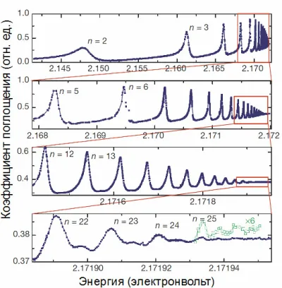 Однако недавно, в 2014 году, экситон в закиси меди проявил себя с неожиданной стороны. Экспериментаторы из Технического университета Дортмунда (Германия) смогли значительно продлить серию экситонных состояний и обнаружили экситоны с главным квантовым числом до 25 (рис. 3) [6].