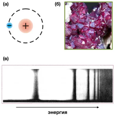 Гросс и Каррыев исследовали спектры пропускания света кристаллов закиси меди — Cu2O (см. фото кристаллов на рис. 2б) и обнаружили несколько ниже края фундаментального поглощения (соответствующего переходам из валентной зоны в зону проводимости, обсуждавшимся выше) серию узких линий, положения которых неплохо описывались формулой (1). Соответствующий спектр представлен на рис. 2в.
