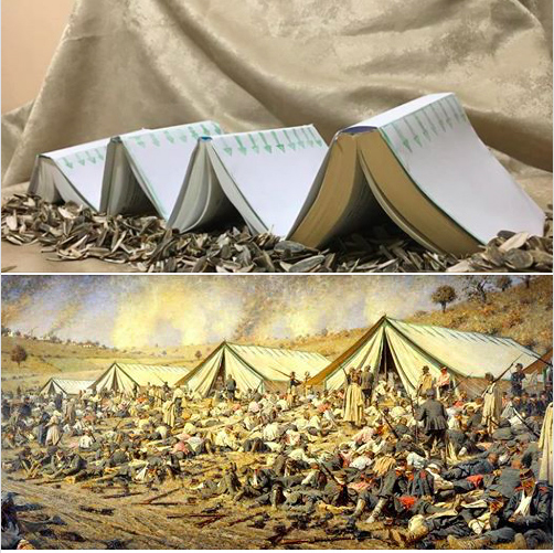 Одним из самых интересных направлений флешмоба, пожалуй, стало переосмысление многофигурных композиций в натюрмортах из домашних вещей. Здесь опять в игру вступают ограничения — какую-нибудь батальную сцену или морской пейзаж невозможно сымитировать дома. Тогда в ход идет именно художественное мышление — на первый план выходит стремление воссоздать цветовое решение оригинала, а композиция осмысляется в простых полуабстрактных геометрических формах. Парусники из носков качаются на волнах смятой голубой простыни, раскрытые книги становятся палатками военного госпиталя, а шелуха от семечек — солдатами, раненными в бою.