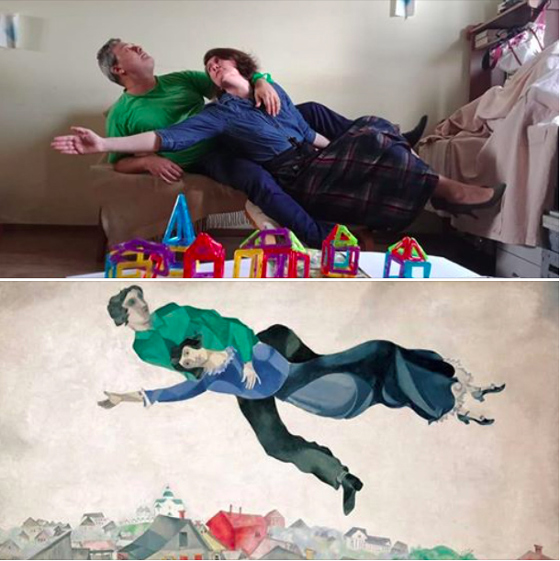 В российском варианте флешмоба вообще часто звучит тема семьи. В его иностранном аналоге с хэштегом #tussenkunstenquarantaine чаще всего встречаются одиночные костюмированные портреты, лишенные какого бы то ни было социального бэкграунда. В отечественном варианте все наоборот — в импровизированном домашнем театре участвуют все поколения. Как ни неожиданно это звучит, но «Изоизоляция» стала важнейшим трендом этой весны в семейной фотографии, отражая философию do it yourself. Один из лучших семейных снимков, на мой взгляд, — уставшие родители взлетают, лежа на диване, вслед за героями Шагала, только город под ними построен из разноцветного детского конструктора.