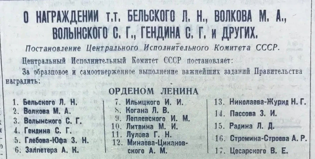 22 июля 1937 года постановлением ЦИК СССР «За образцовое и самоотверженное выполнение важнейших заданий Правительства» орденом Ленина были награждены 17 сотрудников НКВД, в основном из центрального аппарата Главного управления государственной безопасности. В списке, опубликованном в центральных советских газетах, были указаны лишь фамилии и инициалы.