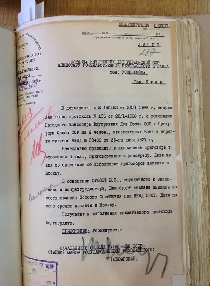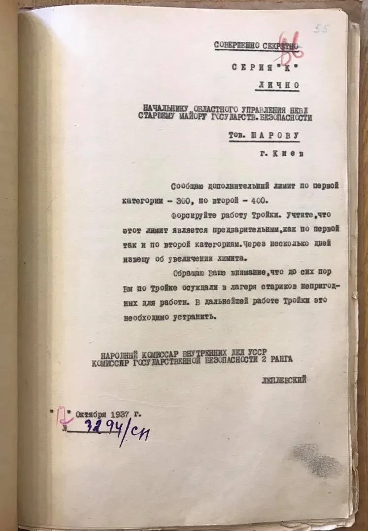 В архиве СБУ найдена шифровка, разосланная Леплевским 17 октября 1937 года в районные управления НКВД УССР: