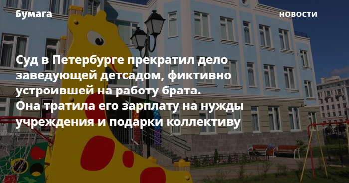 Петроградский районный суд прекратил уголовное преследование заведующей одним из детских садов города Веры Горбачевой, которая фиктивно устроила на работу собственного брата и тратила его зарплату на нужды учреждения и подарки сотрудникам. Об этом сообщает объединенная пресс-служба судов.