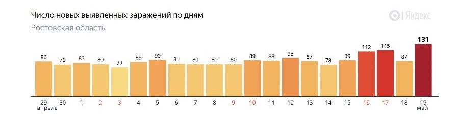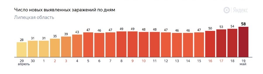 - 6, 13 и 14 мая — выявлено по 46 новых случаев заболевших COVID-19;