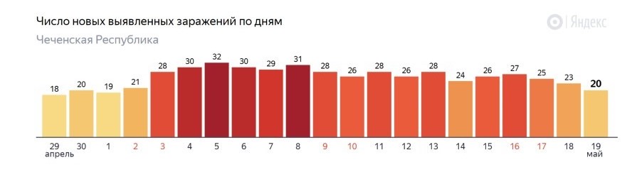 - 3, 9, 11 и 13 мая — по 28 новых случаев коронавируса ежедневно;