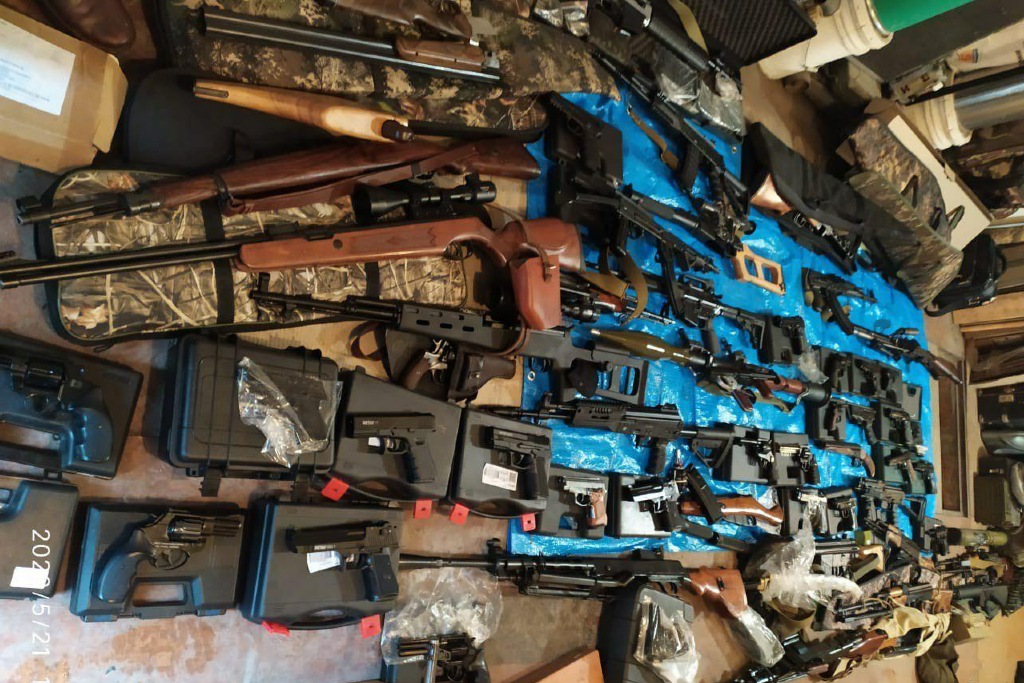 Канал опубликовал фото и видео изъятого оружия и утверждает, что найдено пять пулеметов, 16 автоматов, 32 винтовки, три гранатомета, 30 гранат, 47 пистолетов и патроны.