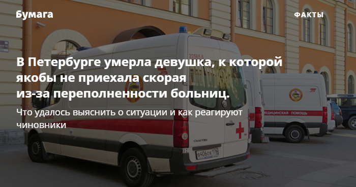 Глава городского комитета по здравоохранению Дмитрий Лисовец также сообщил, что проблем с госпитализацией в тот период быть не могло: «Гибель пациентки наступила 18 апреля, когда мы менее интенсивно работали с коронавирусной инфекцией, чем сейчас (на тот момент в городе выявили 1646 заболевших коронавирусом — прим. „Бумаги“). Говорить о том, что в тот период были проблемы с госпитализацией пациентов в стационары неотложной помощи, не приходится».