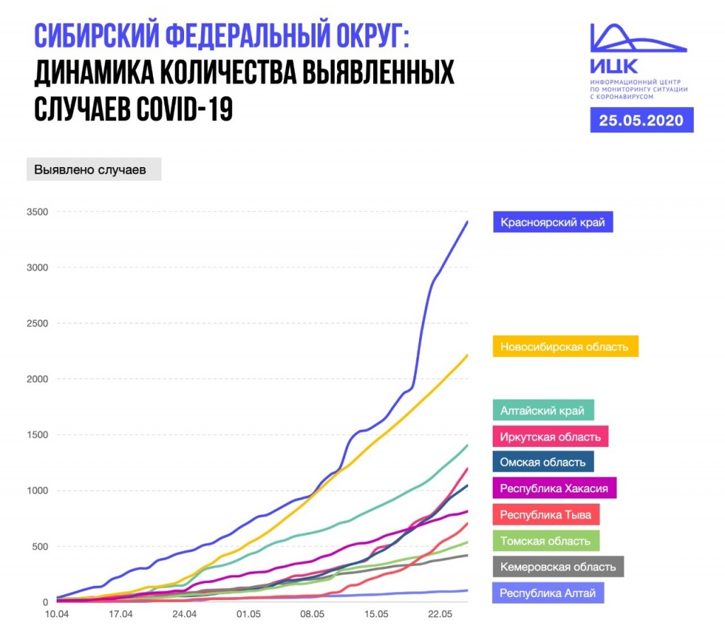 Число новых случаев заболевания коронавирусом в Сибири с 19 по 25 мая выросло на 71%. Это самый высокий показатель среди федеральных округов России — в среднем по стране он упал на 9%, заявили в ИЦК.