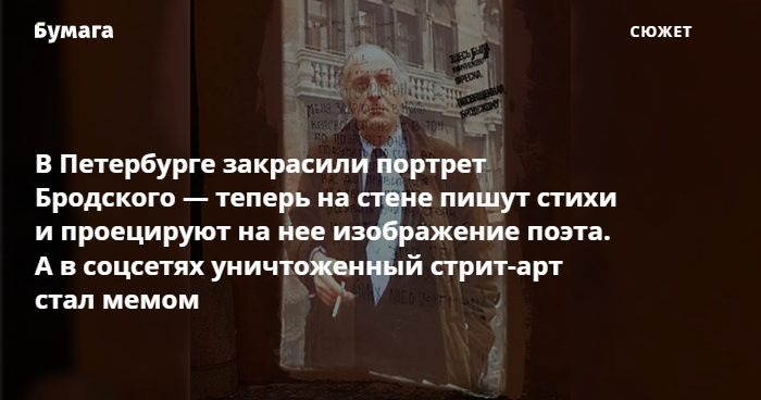 На улице Пестеля ко дню рождения Бродского разместили его портрет, однако работу тут же закрасили по поручению завхоза местной школы. Возмущенные петербуржцы пишут поверх краски стихи и проецируют изображение Бродского на стену. Закрашенный стрит-арт стал мемом в соцсетях: на его месте рисуют Путина, Беглова и Свидетеля из Фрязино.