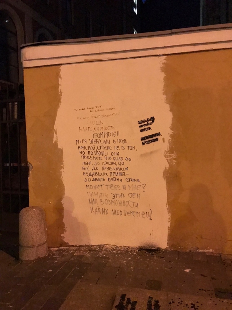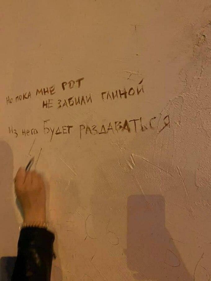 В тот же день на стене появились строки из произведения Бродского «Я входил вместо дикого зверя в клетку…»: «Но пока мне рот не забили глиной, из него раздаваться будет лишь благодарность».