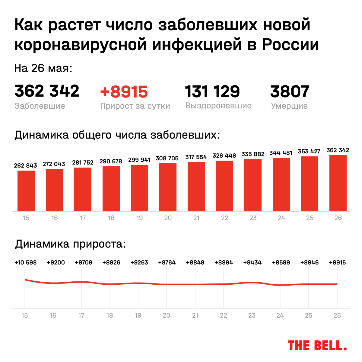 За сутки к 26 мая в России зарегистрировано 8915 новых случаев коронавируса. Всего с начала эпидемии - 362 342 случая.