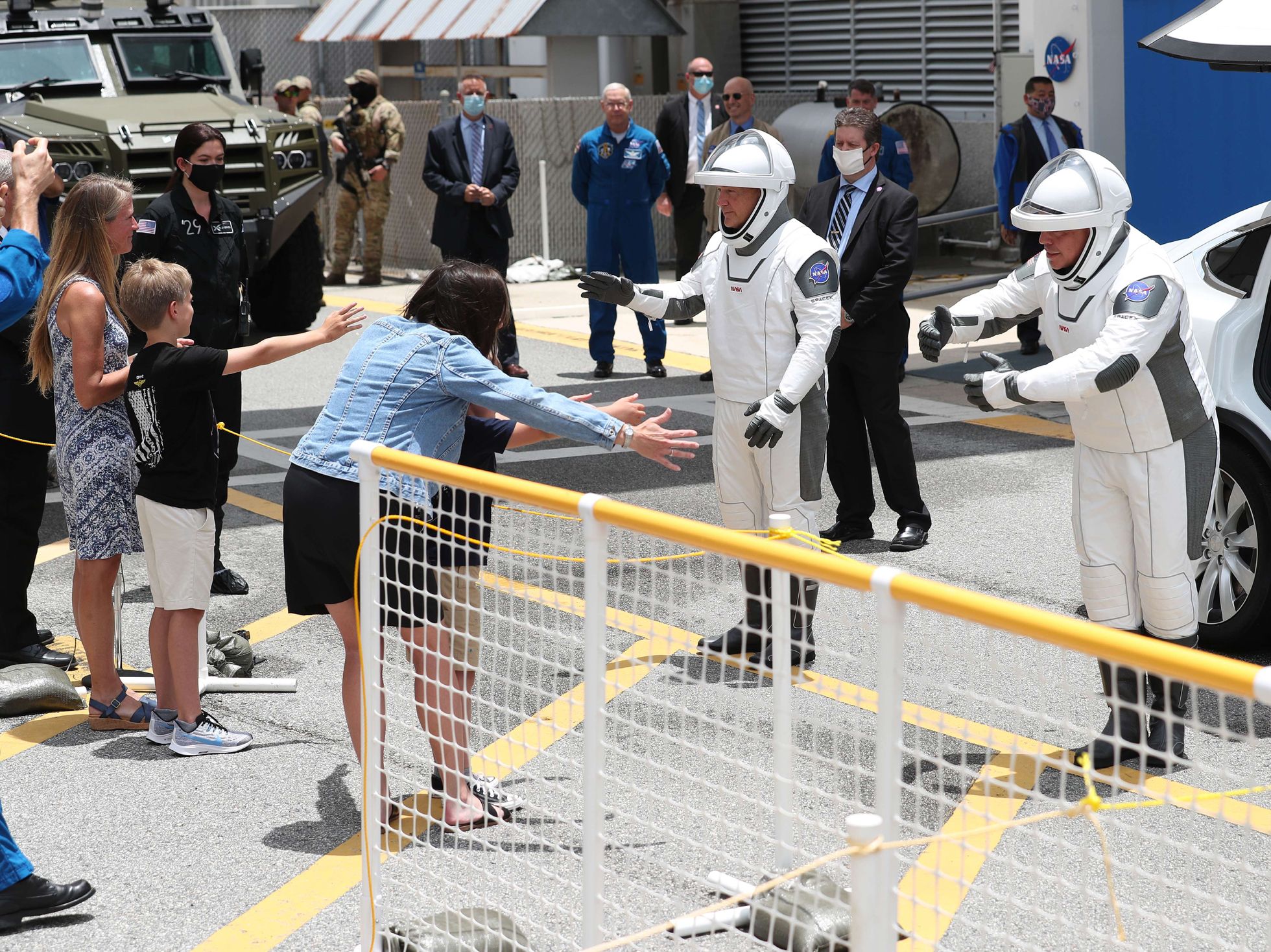 Астронавты первой пилотируемой миссии SpaceX прощаются с семьями перед стартом. Фотография