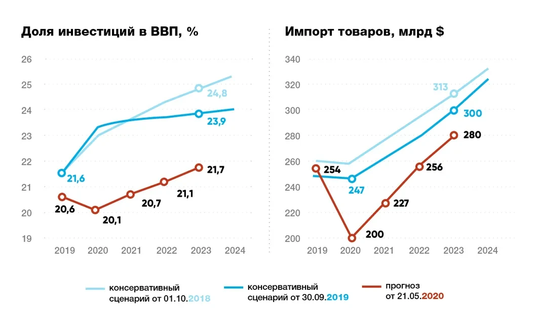 Экономия бюджета и госрасходов на инфраструктуру скажется и на объеме инвестиций в ВВП. Предыдущий министр экономического развития Максим Орешкин призывал увеличить долю инвестиций в ВВП с 20 % до 25 %, но эпоха инвестиционного роста так и не началась. В новом прогнозе мы видим 21–22 % долю инвестиций в ВВП по сравнению с 24–25 % в прошлых консервативных сценариях.