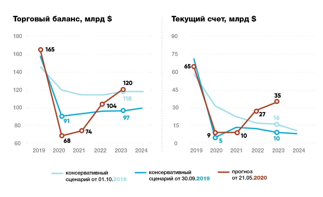 Примерно на $20 млрд в 2023-м будет больше размер торгового баланса и текущего счета, что означает либо соответствующее увеличение иностранных сбережений резидентов, либо снижение цены нефти в бюджетном правиле и возобновление покупок иностранной валюты в ФНБ при более низкой цене нефти. В нынешнем правиле цена отсечения должна вырасти с $42,4 в 2020-м до $45 в 2023-м. Как будто нас готовят к новой бюджетной консолидации по образцу 2015–2017 гг.