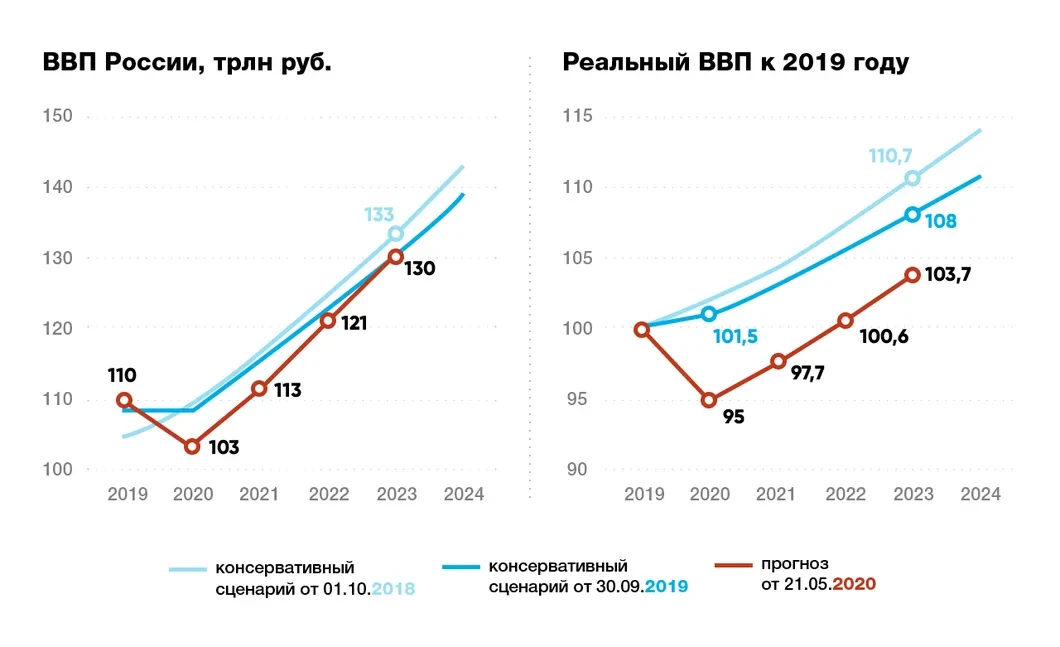 Минэкономразвития (МЭР) пока ожидает снижения ВВП лишь на 9,5 % во II квартале и на 5 % за весь 2020 год с последующим восстановлением примерно по 3 % в год. Цифры выглядят слишком оптимистичными для этого года и консервативными для будущего восстановления экономики.