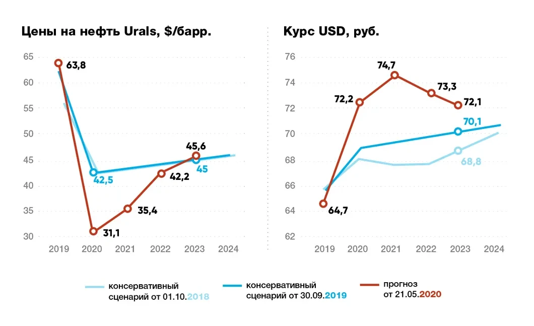 Выглядит странным, что курс доллара США при одинаковых ценах на нефть и инфляции увеличивается от прогноза к прогнозу. В 2018 году средний курс для 2023-го ожидался меньше 69 руб., в 2019-м — 70, а в последнем прогнозе — уже 72 руб. при нефти $45,6 за баррель — даже выше, чем при текущей цене $35 за баррель.