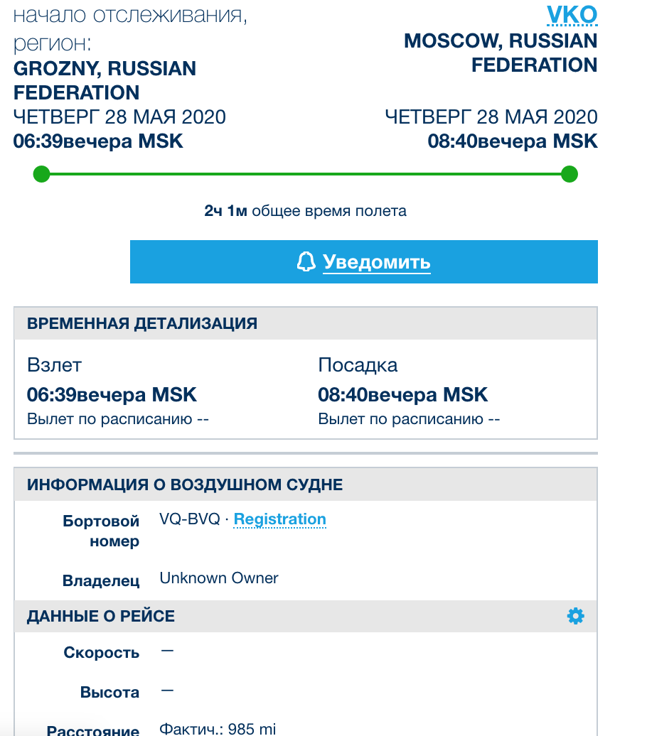 Этот же самолет на днях передвигался дважды: 21 мая он вылетал из Грозного в Москву, а 25 мая – обратно. В эти же дни СМИ сообщали, что Кадыров доставлен в Москву с подозрением на коронавирус. 26 мая глава Чечни впервые появился на публике после сообщений о госпитализации.