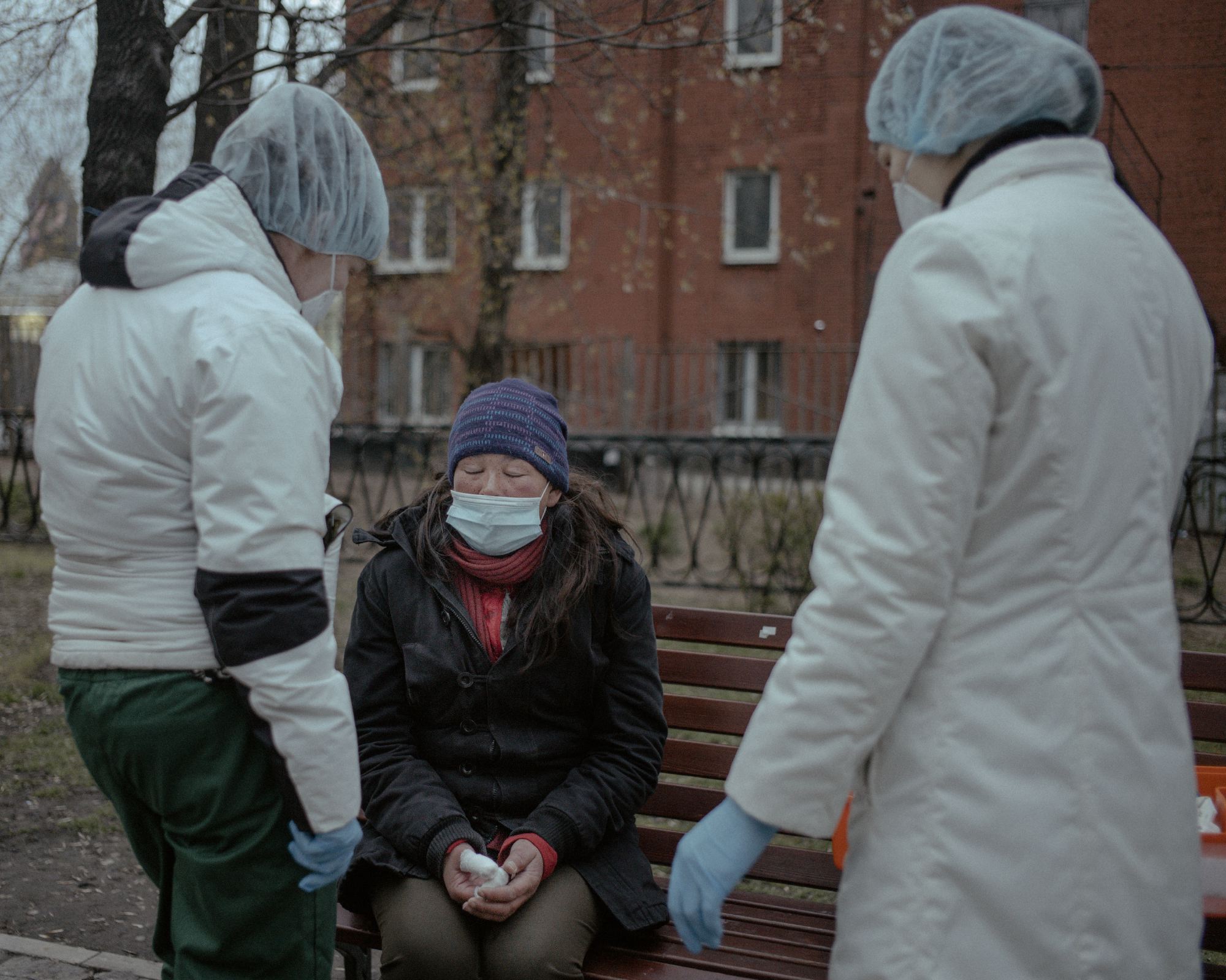 Женщина из Сибири потеряла работу и оказалась в Москве без средств и жилья. У нее начался кашель и поднялась высокая температура. На фото с ней разговаривают Лана и Марина, врачи «Дома друзей», благотворительной организации, помогающей бездомным людям получить медицинскую помощь
