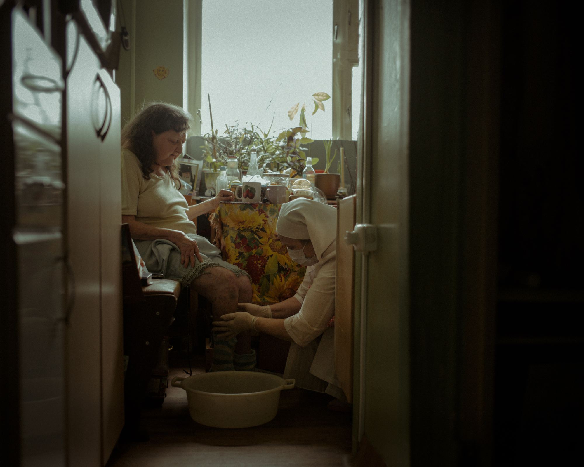 В квартире Людмилы Александровны. Медсестра Наталья Георгиевна приходит к ней трижды в неделю. Сын Людмилы Александровны работает посменно, двое суток без перерыва, и в смену сам не может о ней позаботиться. Наталья — сестра милосердия православной службы «Милосердие». Она ухаживает за пожилыми и немощными людьми, которым некому помочь. Наталья говорит, что с каждым днем у нее на попечении все больше пациентов, и, если она не приедет, они останутся совсем одни