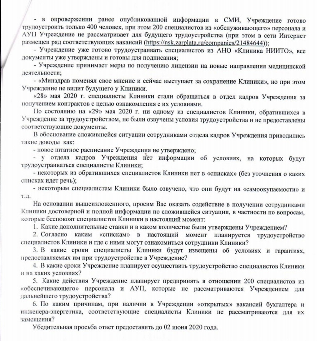 Коллектив новосибирской «Клиники НИИТО» обратился в профсоюз работников здравоохранения. Медики пожаловались на отказ в предоставлении разъяснений о возможном трудоустройстве в ФГБУ «Новосибирский НИИТО имени Цивьяна».