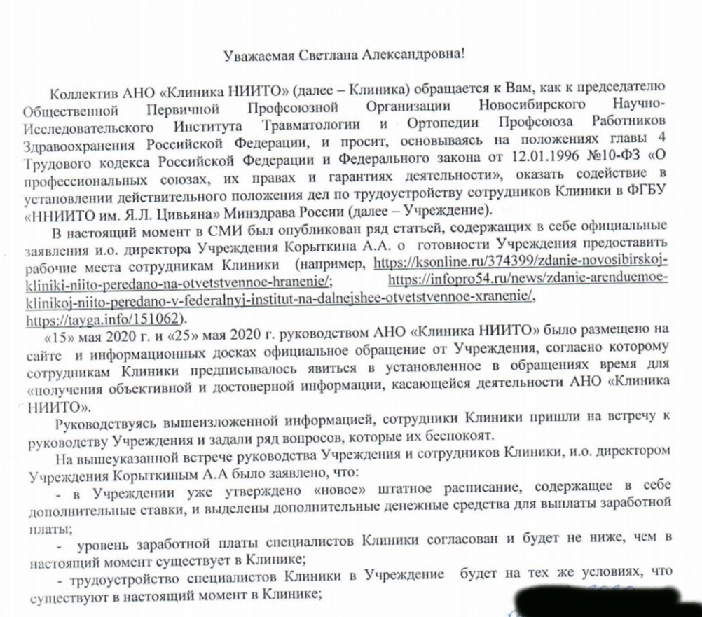 Тайга.инфо публикует обращение коллектива АНО «Клиника НИИТО», поступившее в редакцию. Под ним подписали 118 сотрудников учреждения. Оно адресовано главе первичной организации профсоюза работников здравоохранения в ФГБУ «ННИИТО имени Цивьяна» Светлане Молоковой.