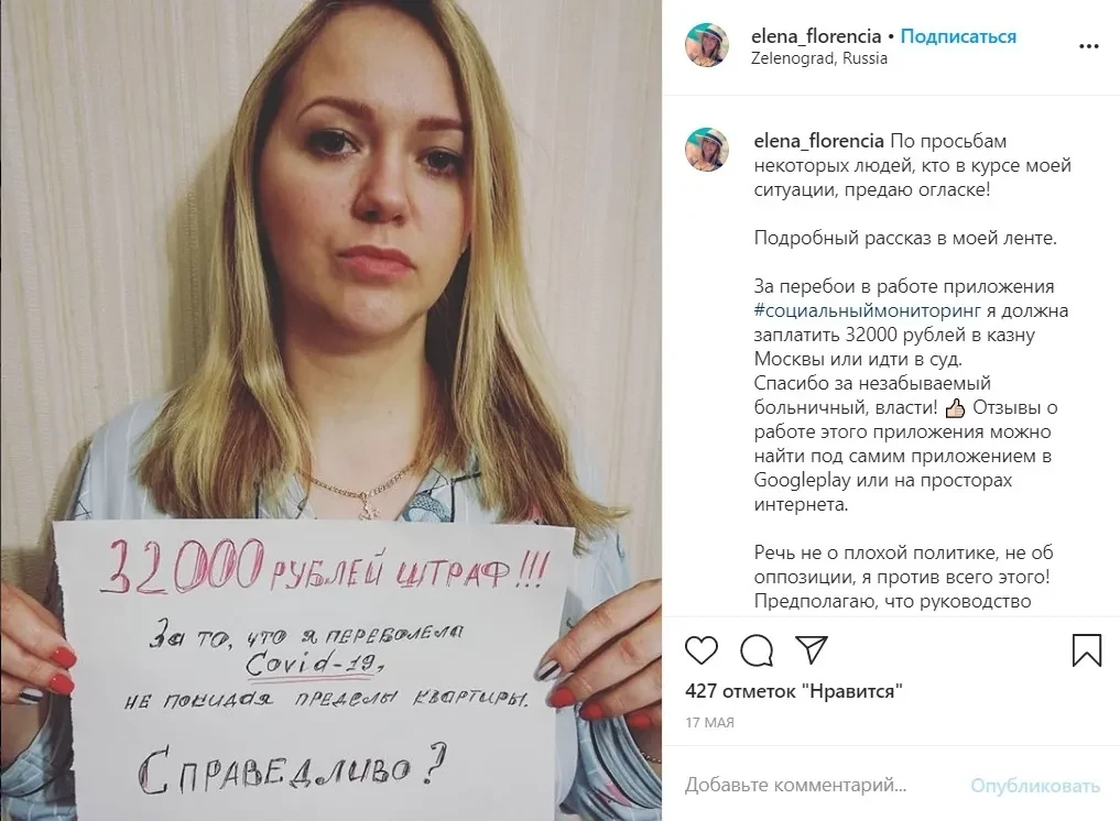 В Instagram опубликованы десятки видео, на которых люди показывают в камеру письма со штрафами и в растерянности, а иногда со слезами в голосе и на лице спрашивают, что со всем этим делать. Один штраф — 4 тысячи рублей. Человек с подтвержденным коронавирусом или с подозрением на инфекцию послушно сидит на карантине, но за день может задолжать государству больше десяти тысяч рублей, просто потому, что не прибежал на звук приложения сделать свою фотографию на фоне дивана и обоев. А если и прибежал — его фотография «зависла» при загрузке, и приложение пришлось переустанавливать.