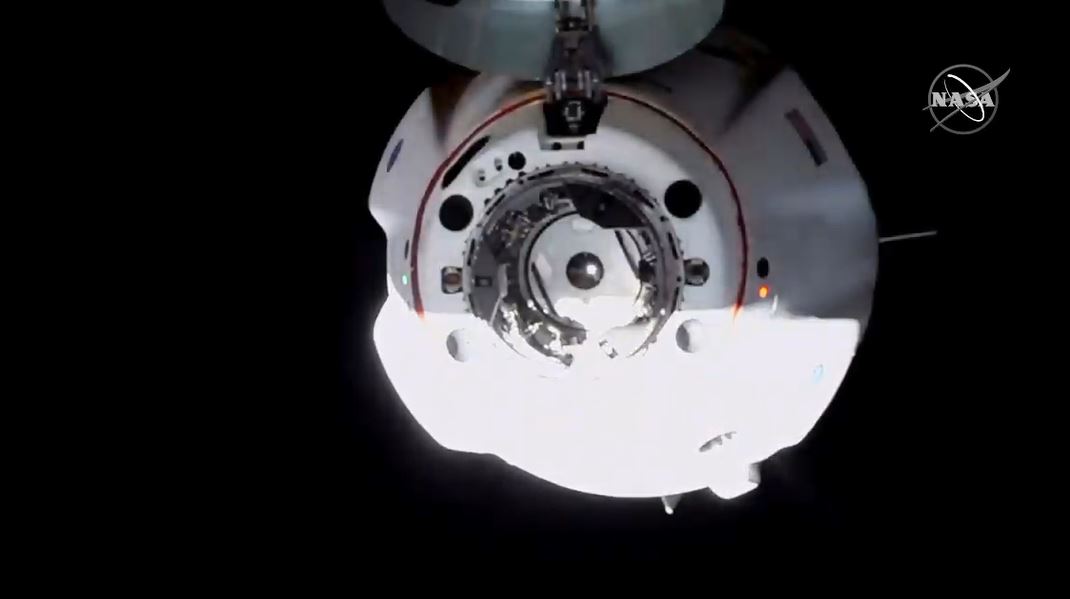 Космический корабль Crew Dragon Илона Маска успешно состыковался с Международной космической станцией. Через два с небольшим часа астронавты перейдут с корабля на борт МКС.