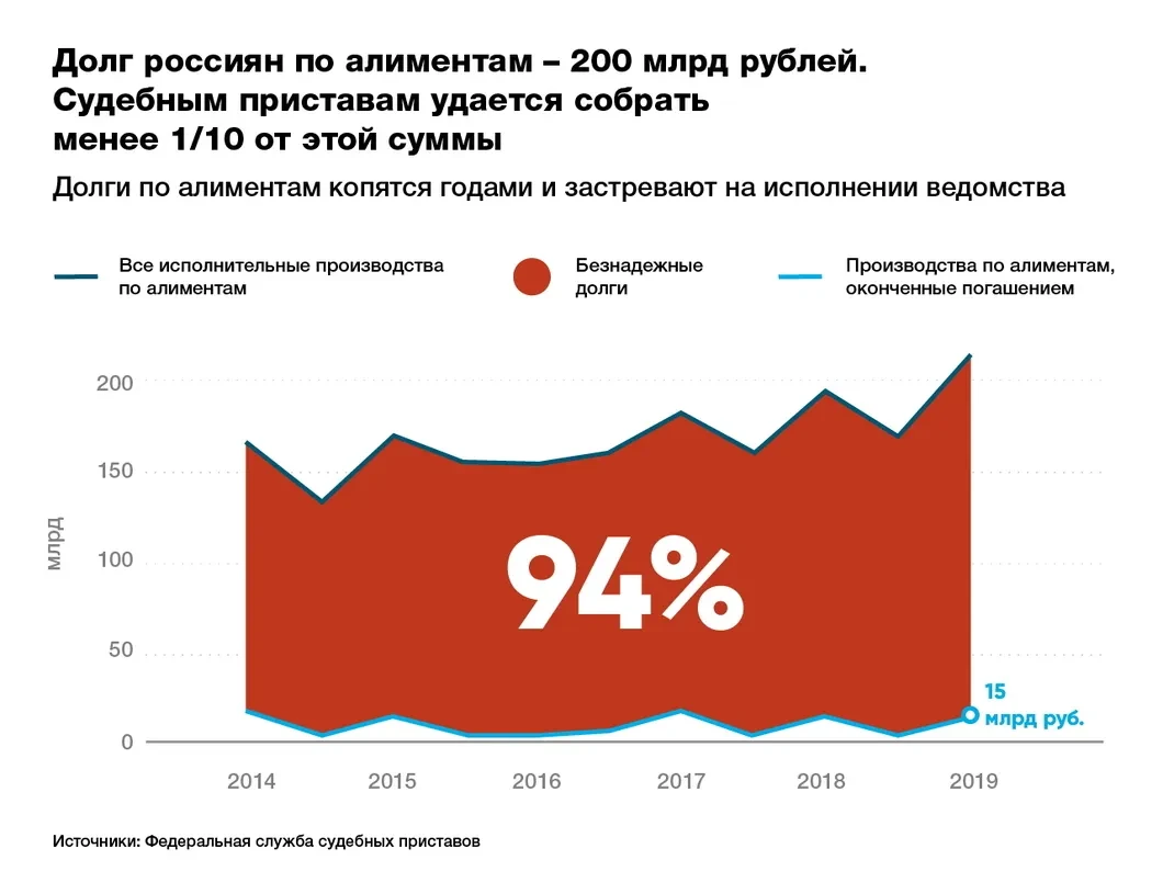 Эффективность работы приставов можно оценить, обратив внимание на контекст. Общая сумма долгов по алиментам на конец 2019 года превысила 200 млрд руб.