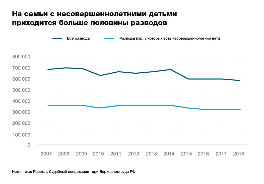 Обратить внимание на количество разводов в России стоит не ради тезисов о кризисе семейных ценностей. Эта статистика говорит о том, что россиянам необходимо научиться грамотно разводиться, чтобы после расставания сохранить партнерские отношения и не стать противниками. Особенно важно это в случаях, когда в семье есть несовершеннолетние дети, — закон охраняет их право на заботу родителей, вне зависимости от того, являются те мужем и женой или нет.