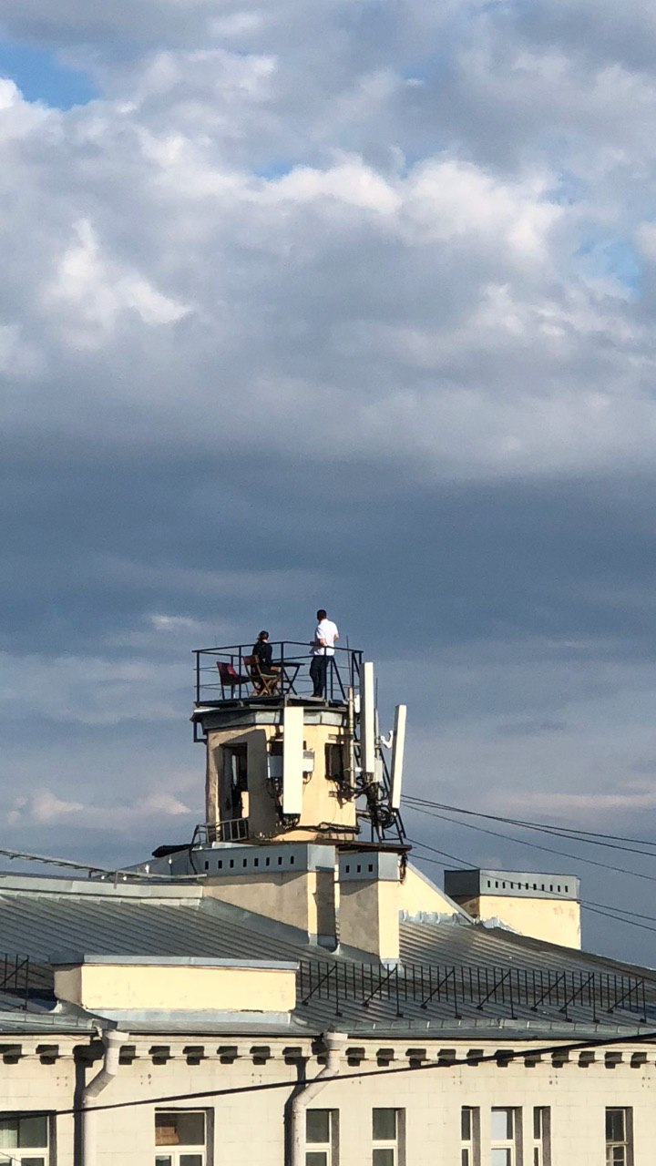 Во время майских праздников на крыше жарили шашлыки. Один из мужчин готовил еду, другой обмахивал мясо, чтобы оно не подгорело. Позже полиция попросила их покинуть крышу.