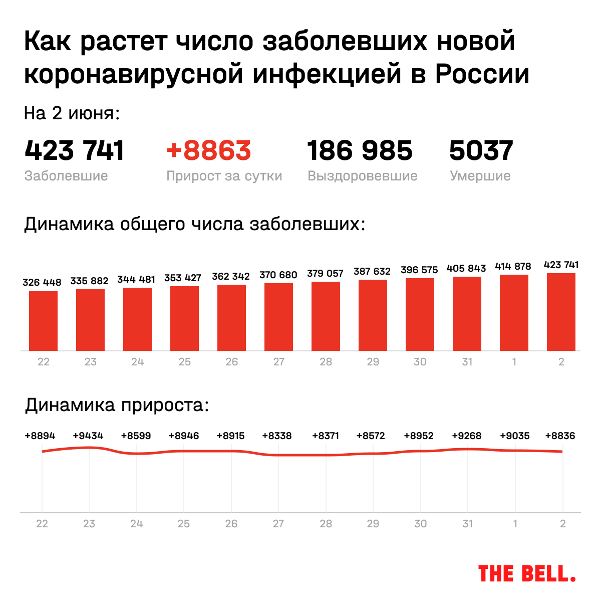За сутки к 2 июня в России снова выявлено меньше 9 тысяч новых случаев коронавируса, всего 8863, сообщил сегодня оперштаб Москвы. Всего с начала эпидемии — 423 741.