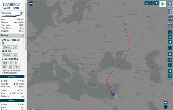 Согласно данным сервиса, самолет вылетел из московского аэропорта Внуково в 10:46 (мск) и приземлился в аэропорту Тель-Авива в 14:44. Спустя 1 час 15 минут борт вновь вылетел из Тель-Авива в обратном направлении.