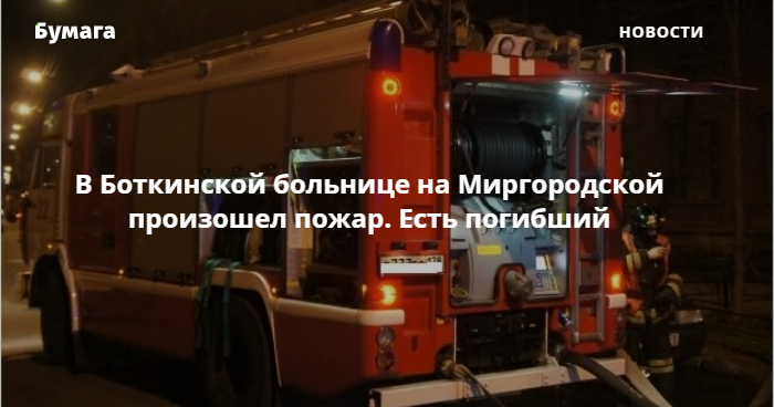 В Боткинской больнице на Миргородской улице в ночь на 3 июня произошел пожар, в результате которого погиб один из пациентов. Об этом «Бумаге» сообщили в пресс-службе ГУ МЧС по Петербургу.