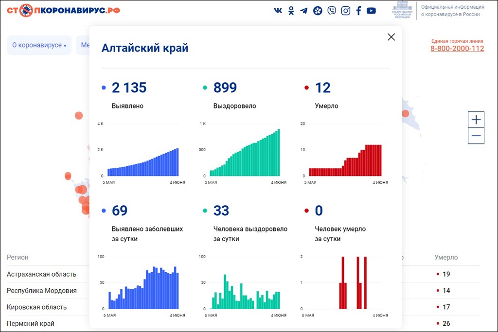 Всего же в Алтайском крае, по последним данным, подтверждено 2135 случаев заражения. Выздоровел 861 человек, заявили в оперативном штабе региона. Федеральный же штаб завысил этот показатель до 899 при таком же числе заболевших.