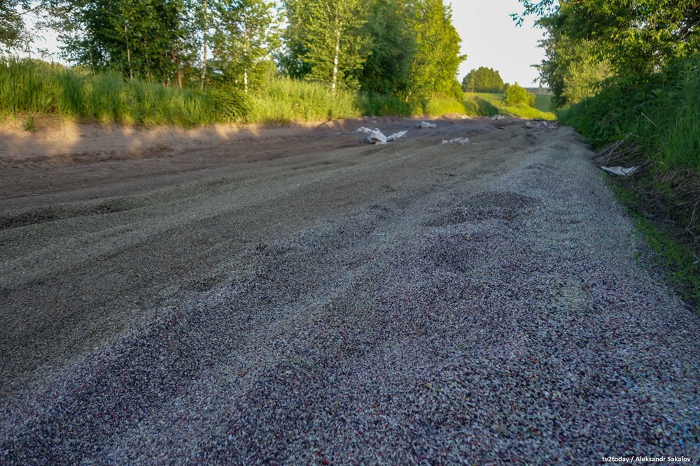 Переработанным пластиком отсыпали примерно 200 метров дороги у поселка Заварзино в пригороде Томска. Дорога сильно разбита, и сразу, как заканчивается отсыпанная часть, появляются глубокие ямы и широкая колея.