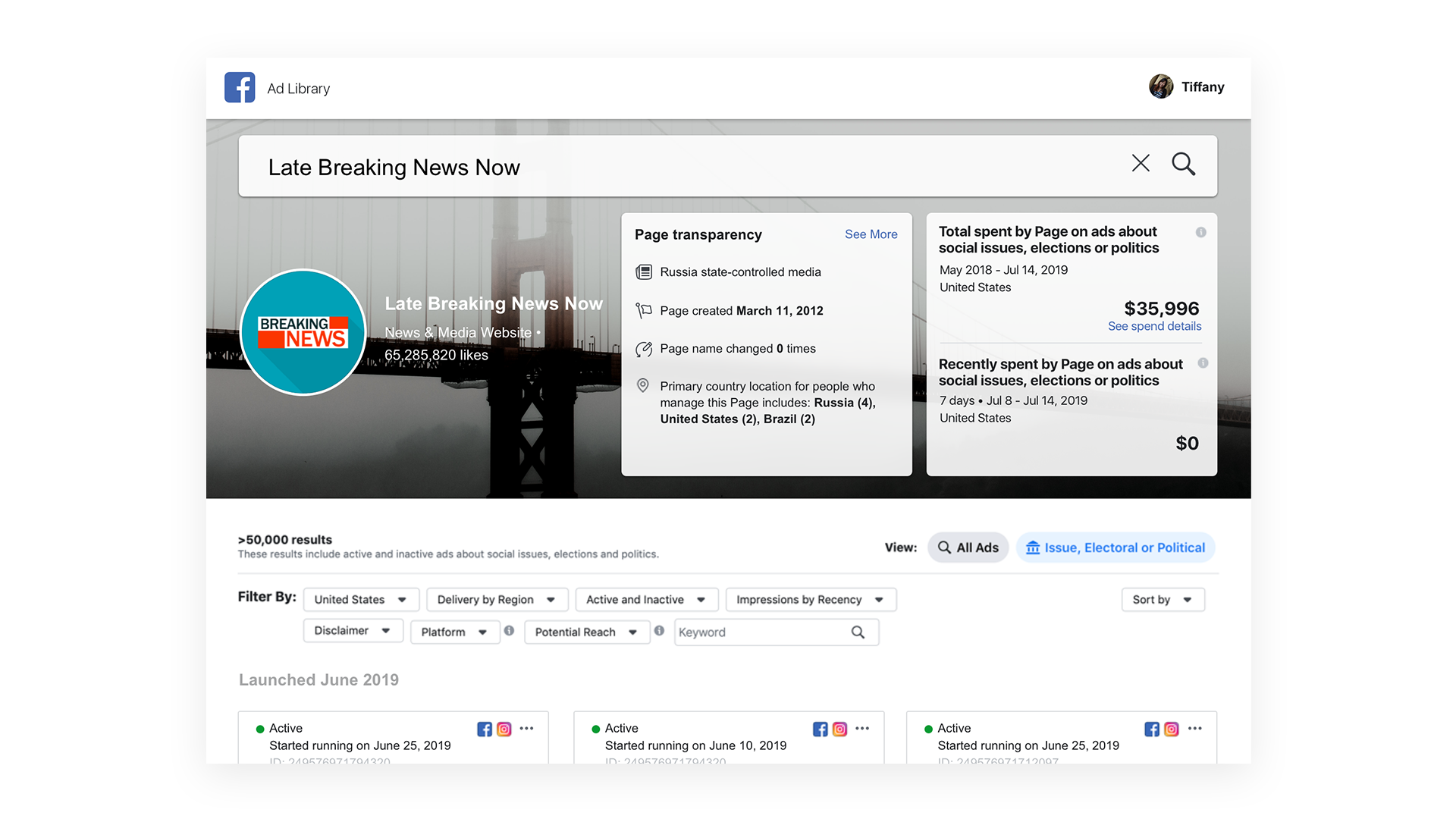 В качестве примера того, как это будет выглядеть, Facebook привела вымышленный «контролируемый Россией» аккаунт.