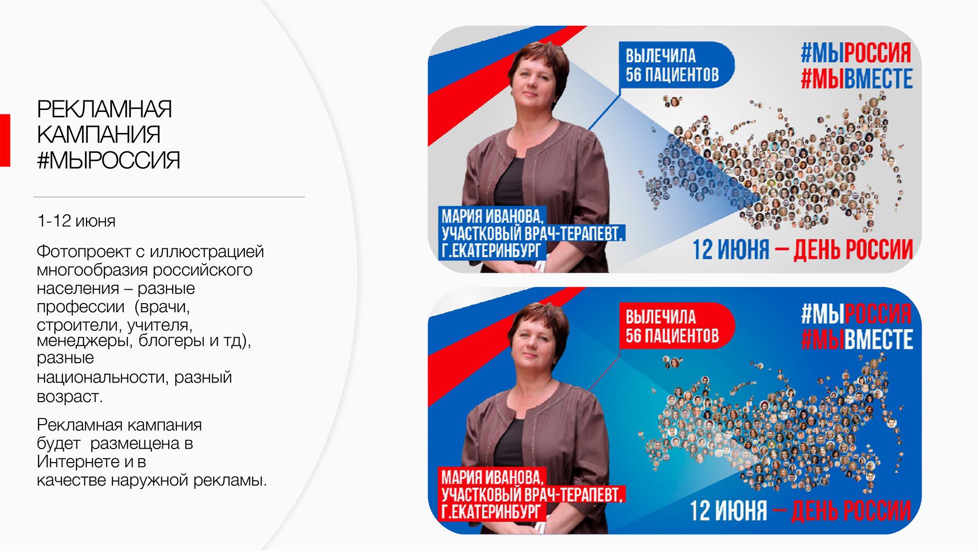 «Главная ценность нашей страны во все времена — люди. Во время войны именно люди дали врагу достойный отпор и помогали друг другу. Во время пандемии именно люди борются за тех, кто заражен, оберегают тех, кто здоров. Они лечат нас круглые сутки, они водят автобусы и поезда метро, доставляют продукты и лекарства, убирают улицы и дезинфицируют подъезды. Все они наши герои, поэтому День России должен быть посвящен им», — говорится в преамбуле к презентации проекта. Фотографии людей, которые «продолжают трудиться ради нас», появятся на билбордах в российских городах и на баннерах в интернете.
