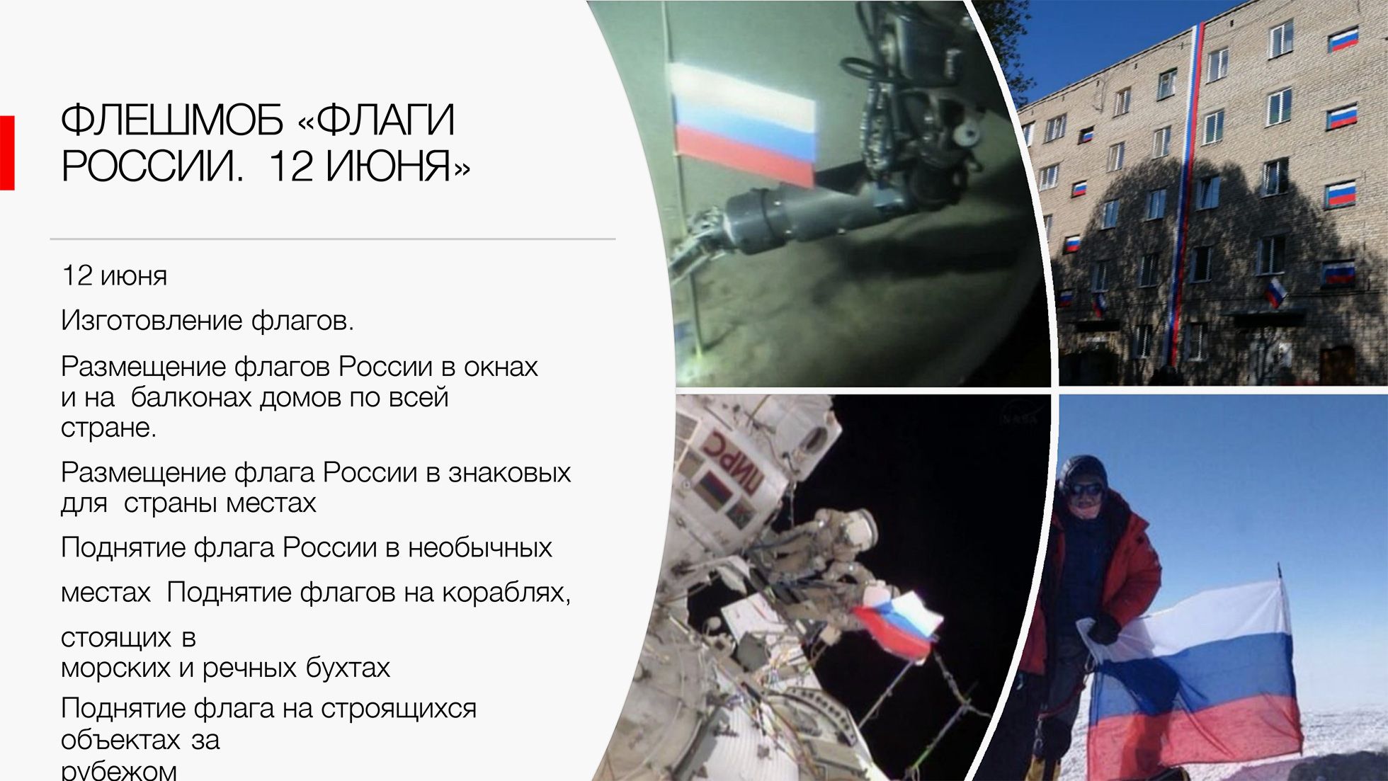 На 12 июня планируется флешмоб «Флаги России»: его участники должны разместить триколоры в окнах и на балконах. Кроме того, флаги должны появиться в «знаковых и необычных местах России». В тот же день «семейные хоры» исполнят гимн России и «популярные песни о России» на центральных площадях городов. На Яндекс-панорамах можно будет «совершить онлайн путешествие» по «заповедным местам России».