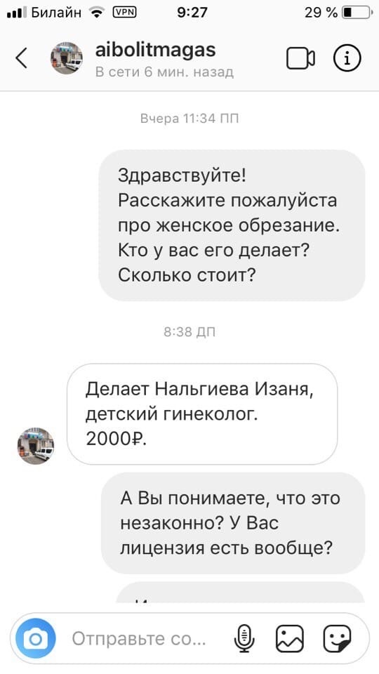 У центра «Айболит» есть официальный аккаунт в инстаграме. Сестра пострадавшей девочки, узнав о случившемся, отправила туда личное сообщение с вопросом, сколько стоит женское обрезание и кто его делает. Ей ответили, что операцию проводит Изаня Нальгиева.