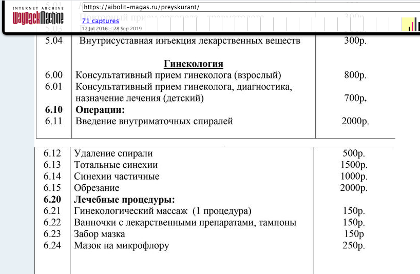 Скриншот списка услуг медцентра «Айболит» за 2016 год, найденный в кэше