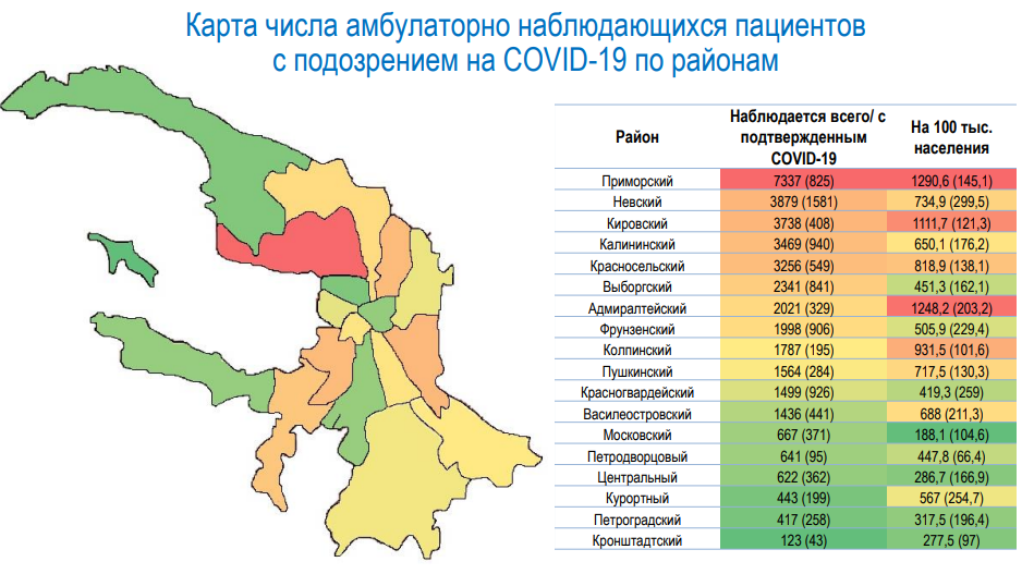 Согласно документу, больше всего пациентов с подозрением на коронавирус наблюдается в Приморском районе (7337). На втором месте по числу амбулаторных пациентов — Невский район (3879). На третьем — Кировский (3738).