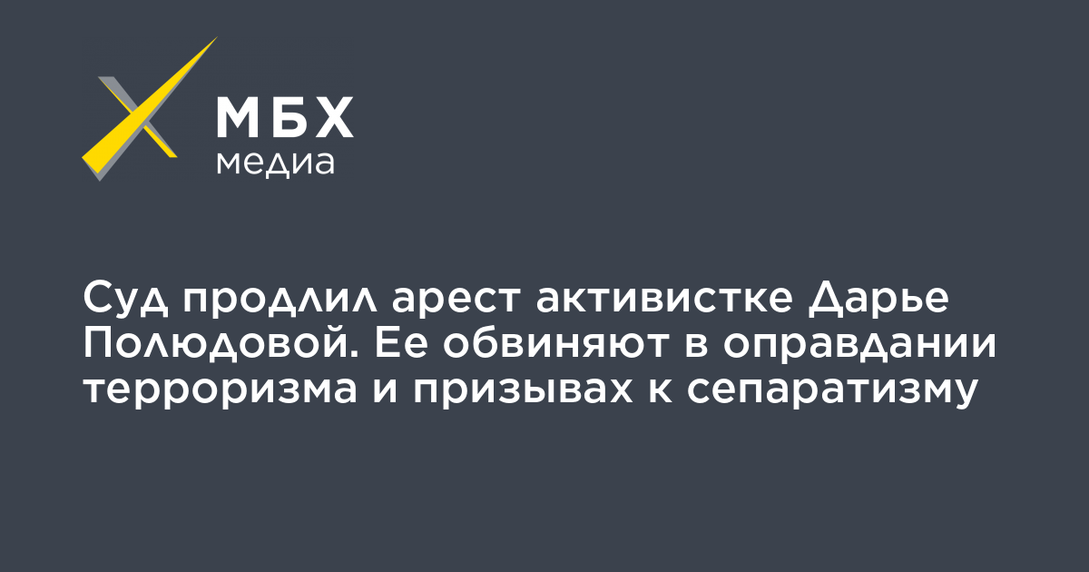 Об уголовных делах о призывах к сепаратизму и терроризму, возбужденных в отношении Полюдовой, стало известно 16 января. Тогда Мещанский районный суд арестовал активистку на два месяца. Позже срок содержания под стражей продлили еще на три месяца, до 13 июня.