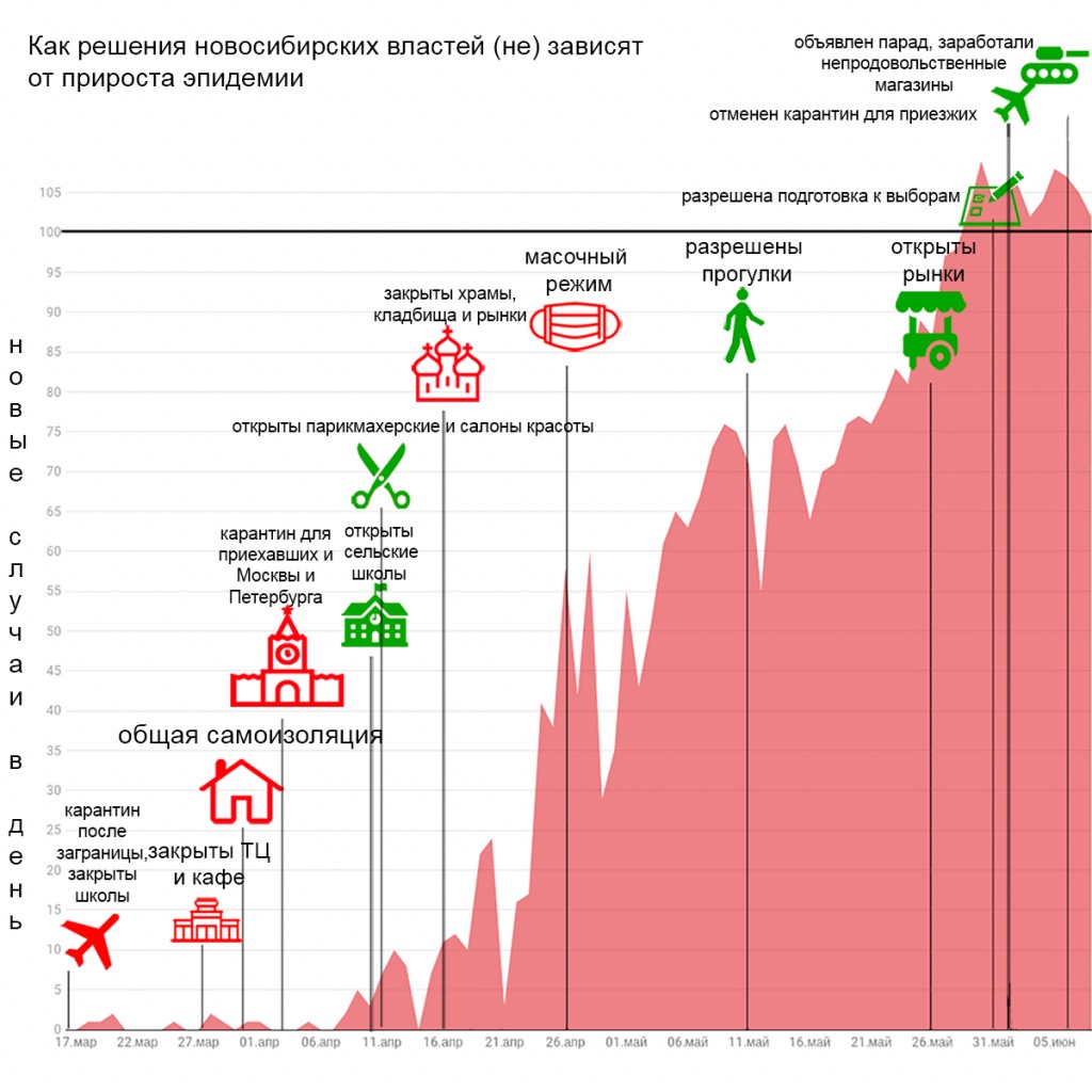 Более 100 случаев заражения коронавирусной инфекцией фиксируют в Новосибирской области с 29 мая. С этого момента губернатор Андрей Травников только ослабляет противоэпидемические меры.