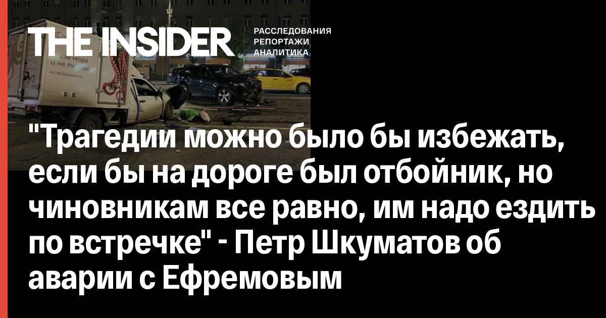 Минувшей ночью находившийся в состоянии алкогольного опьянения Михаил Ефремов устроил ДТП на Смоленской площади в Москве. Он столкнулся на автомобиле Jeep Grand Cherokee с автофургоном и другими машинами. Водитель фургона умер в больнице. Актер признал себя виновным в ДТП. В отношении него возбуждено уголовное дело о нарушении правил дорожного движения, совершенном в состоянии опьянения и повлёкшем по неосторожности смерть человека. За это предусмотрено от 5 до 12 лет лишения свободы. The Insider попросил координатора движения «Общество Синих Ведёрок» Петра Шкуматова объяснить, можно ли было избежать конкретно этой трагедии, если бы дорога была построена по правилам.