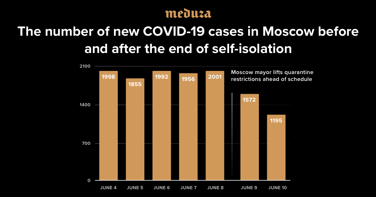 On June 8, Moscow Mayor Sergey Sobyanin announced the end of the capital’s self-isolation regime ahead of schedule. According Meduza’s sources in the government, quarantine restrictions were lifted in an attempt to improve the outcome of the July 1 plebiscite on constitutional amendments, following a conversation between Sobyanin and Russian President Vladimir Putin. In the days after the lockdown’s end, the daily number of new coronavirus cases in Moscow declined sharply — despite the fact that the city was seeing a steady increase of around 2,000 new cases per day the week before.