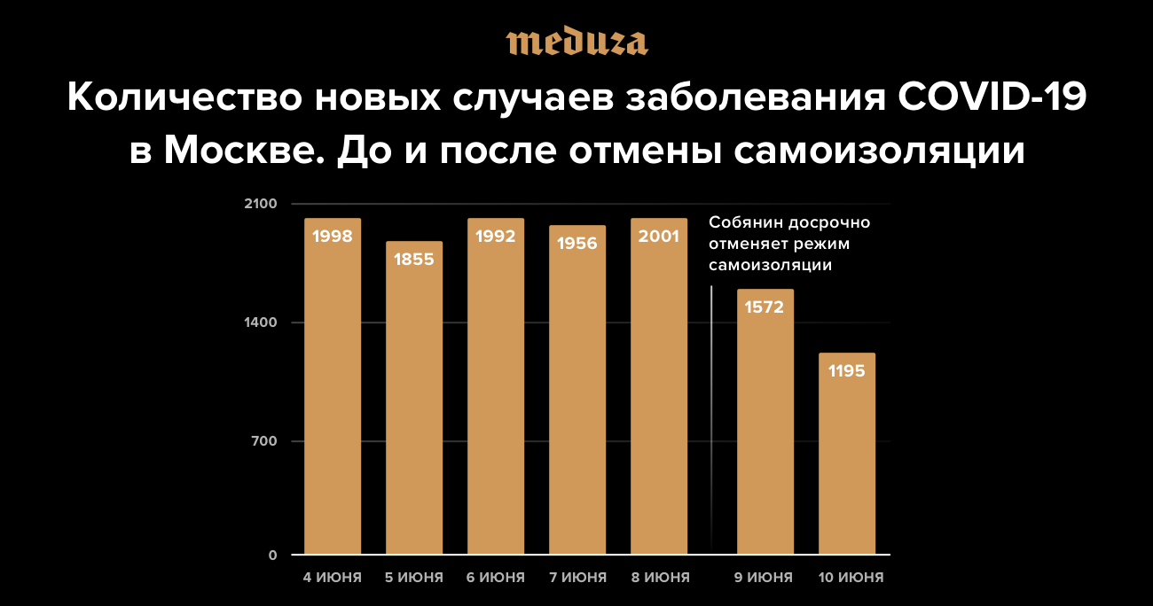 Пресс-секретарь президента Дмитрий Песков заявил, что в России низкая смертность не потому, что статистику фальсифицируют, а потому что система здравоохранения хорошо работает. При этом, по официальным данным, в Москве в мае умерли 15 713 человек — на 5799 больше среднегодового показателя. В 2757 случаях в качестве причины смерти указали коронавирус. А вот как изменилось количество новых ежедневных случаев COVID-19 после досрочного снятия карантина.