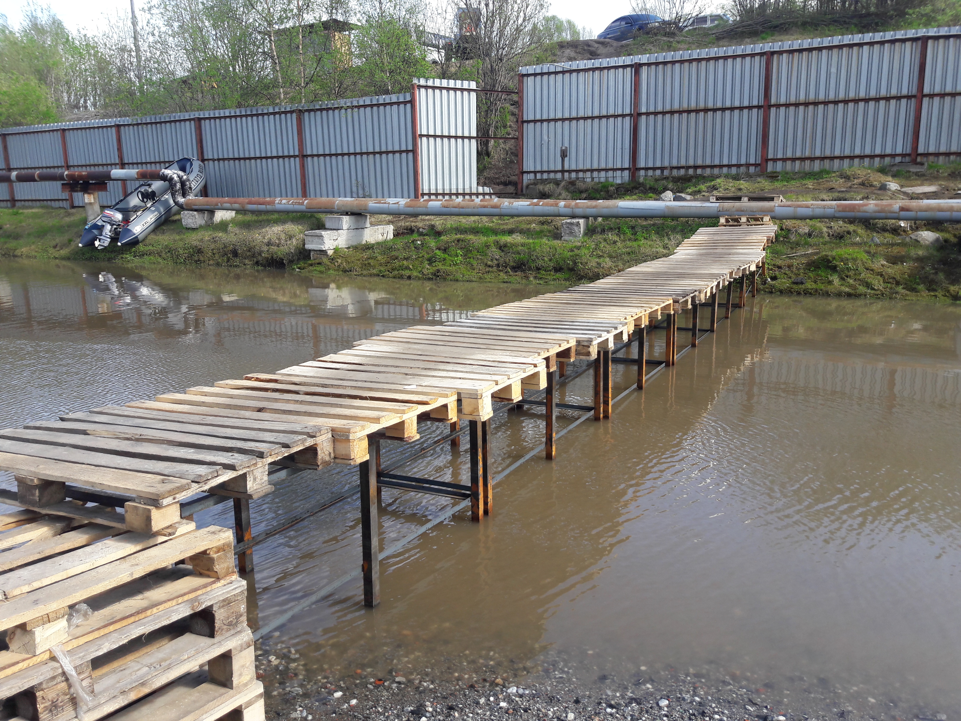 - Первые дни нас возили к цехам на лодках. На резиновые лодки садились у дороги, ехали до зданий. В конце смены так же обратно. Потом вот эти мостки соорудили, по ним ходим.