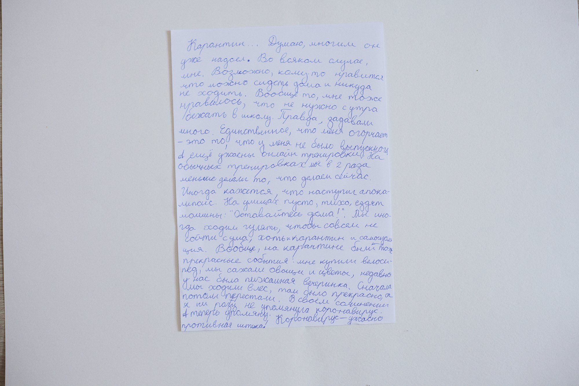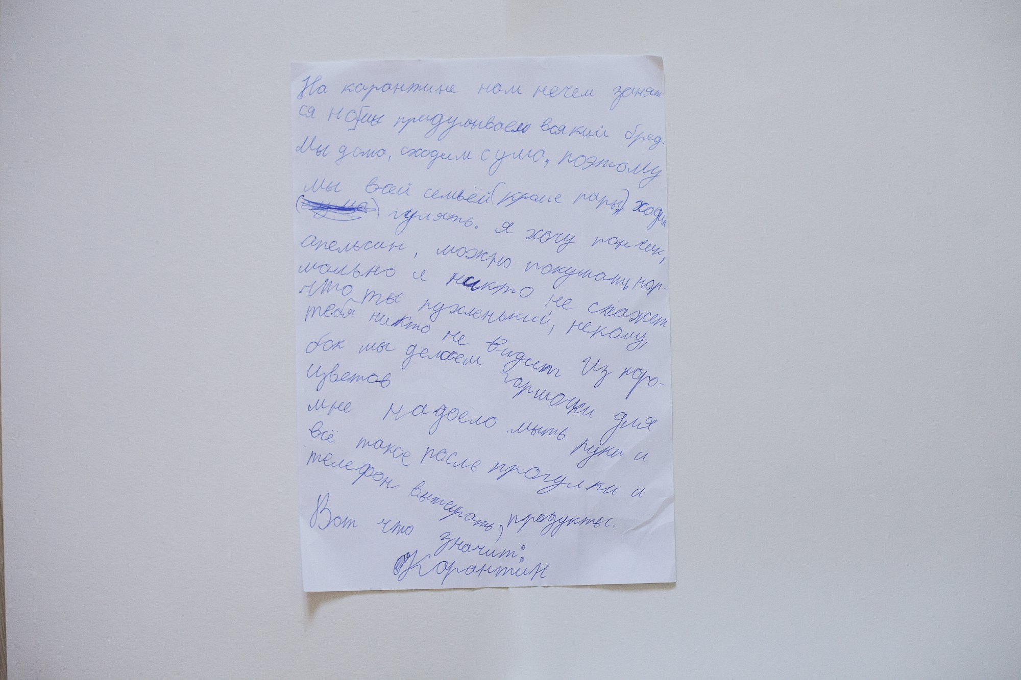 Сочинение сына: «На карантине нам нечем заняться, но мы придумываем всякий бред. Мы дома сходим с ума, поэтому мы всей семьей (кроме папы) ходим гулять. Я хочу пончик, апельсин, можно покушать нормально. И никто не скажет, что ты пухленький — некому. Никто тебя не видит. Из коробок мы делаем горшочки для цветов. Мне надоело мыть руки и все такое после прогулки и телефон вытирать и продукты. Вот что значит карантин!»