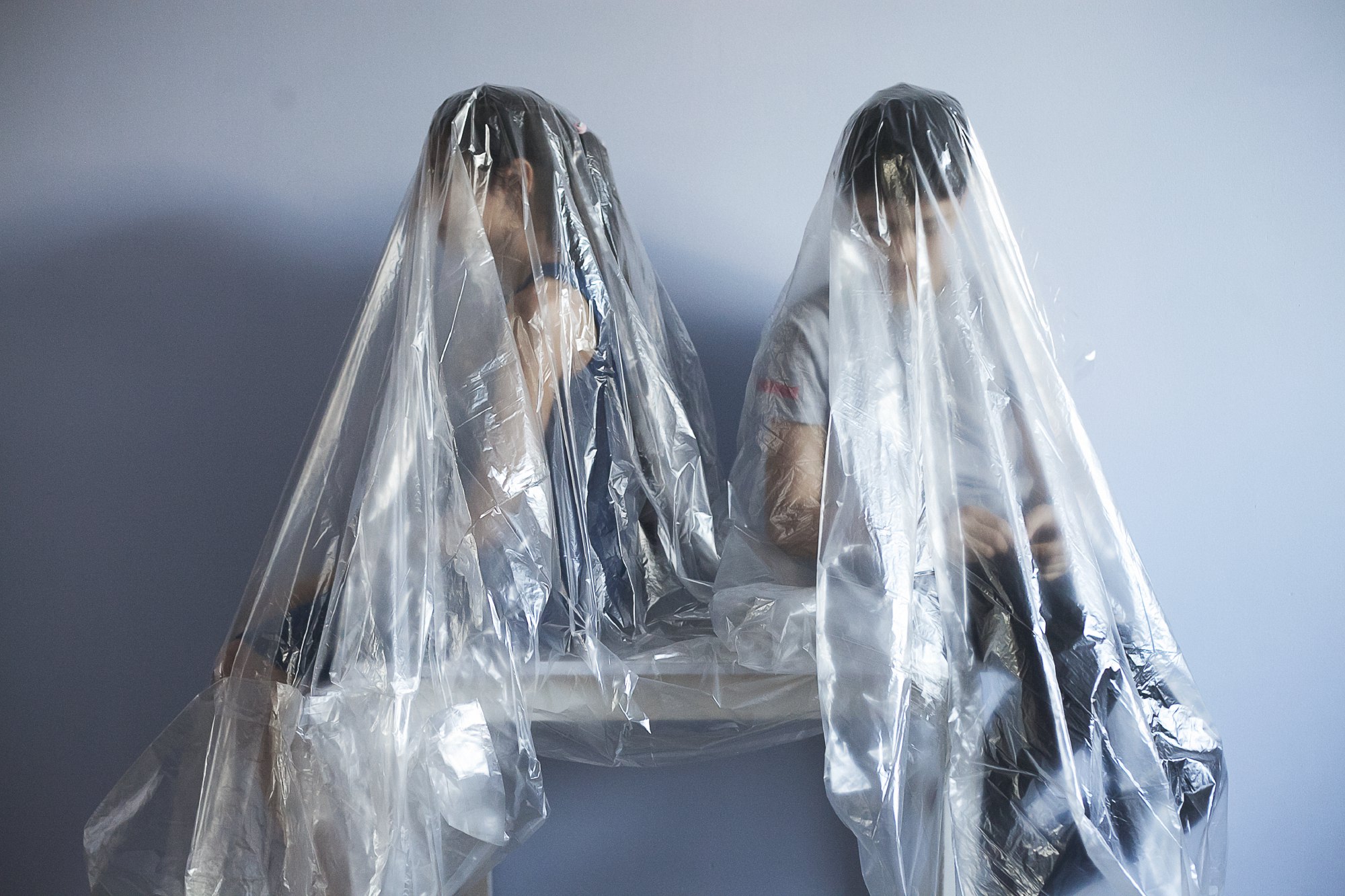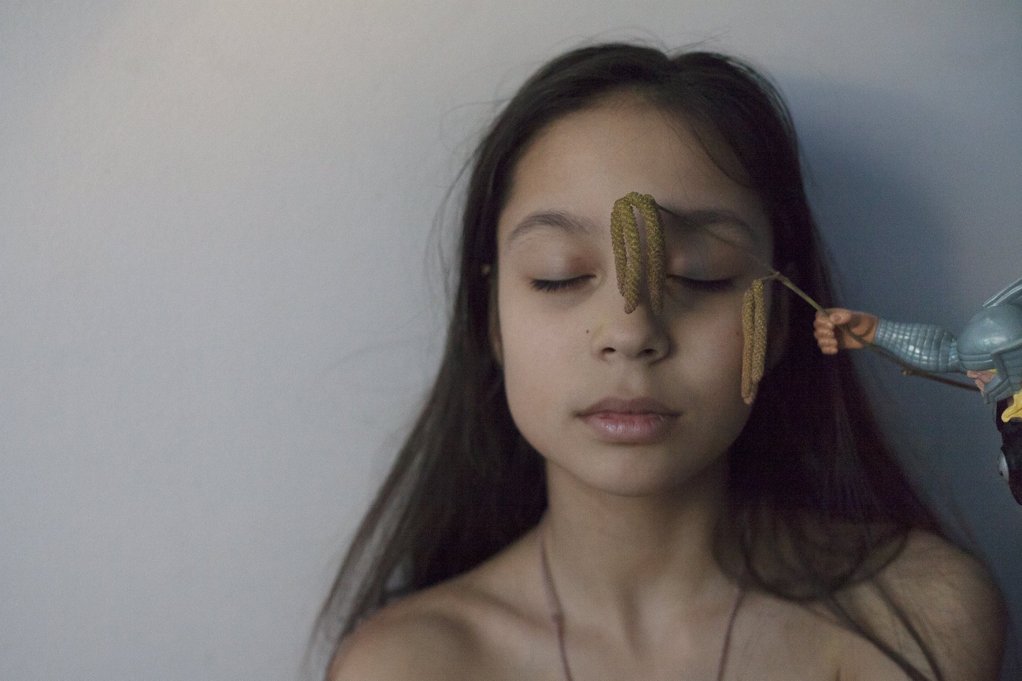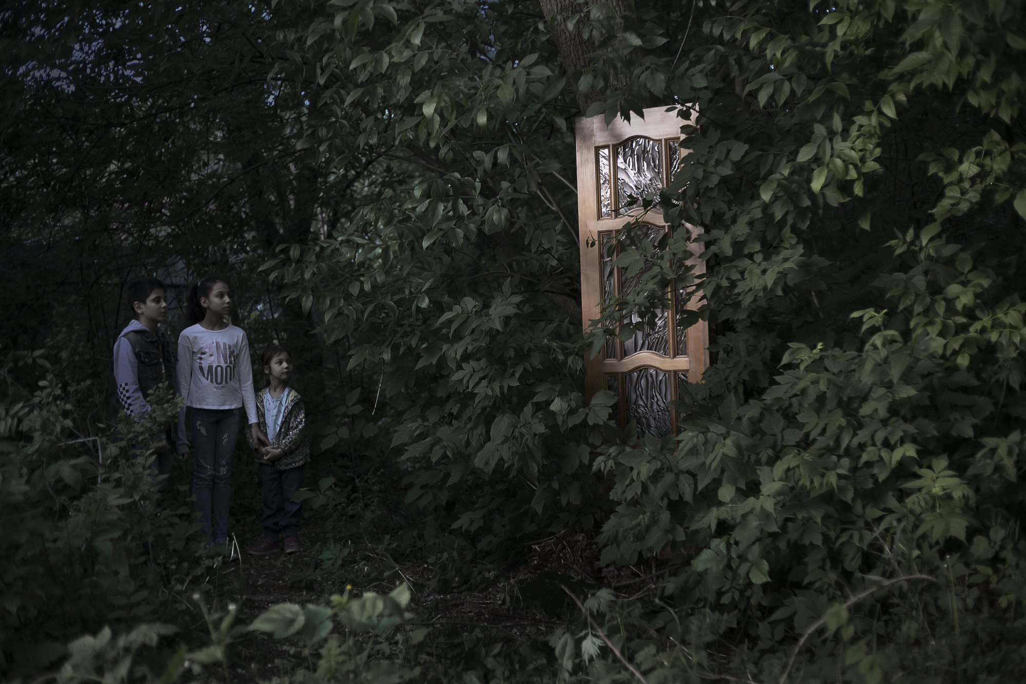 Дети на даче играли с укрывным материалом. Я попросила попозировать мне