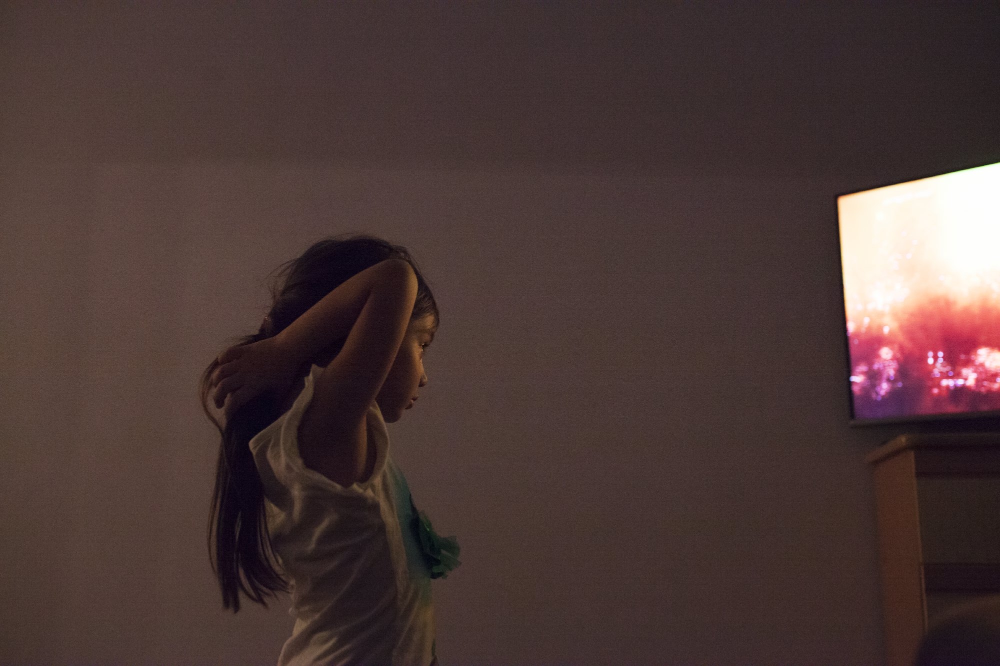 Младшая дочь смотрит салют в честь Дня Победы по телевизору. В этом году только в таком формате